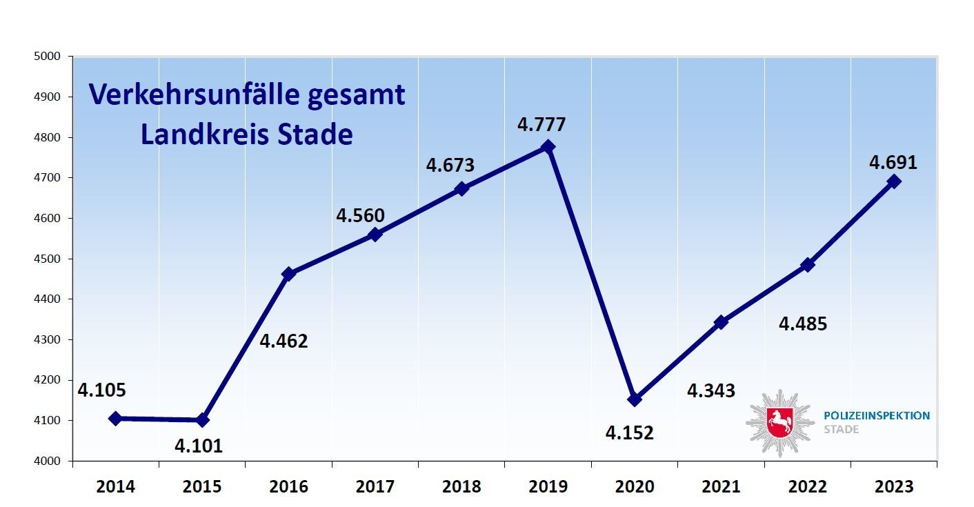 2023 ereigneten sich im Landkreis Stade 4.691 (+ 206) Verkehrsunfälle (VU).