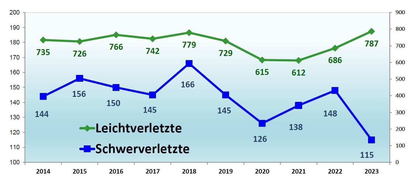 Trotz steigender Gesamtunfallzahlen und damit einhergehend einem Anstieg der Verkehrsunfälle mit Personenschäden ist die Zahl der Schwerverletzten auf 115 Personen (- 33) gesunken. Dagegen stieg die Zahl der Leichtverletzten deutlich auf 787 (+ 101).