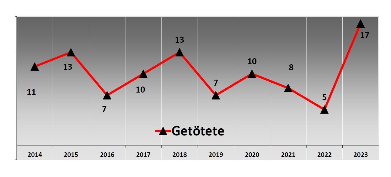 Die Anzahl der sogenannten Baumunfälle ist im vergangenen Jahr auf 111 (+ 7) gestiegen. Dabei hat ebenso die Anzahl der bei Baumunfällen tödlich verunglückten Personen zugenommen, von drei im Jahr 2022 auf fünf und ebenso die Anzahl der Schwerverletzen (30 / + 2) und der Leichtverletzten (33/ + 3).