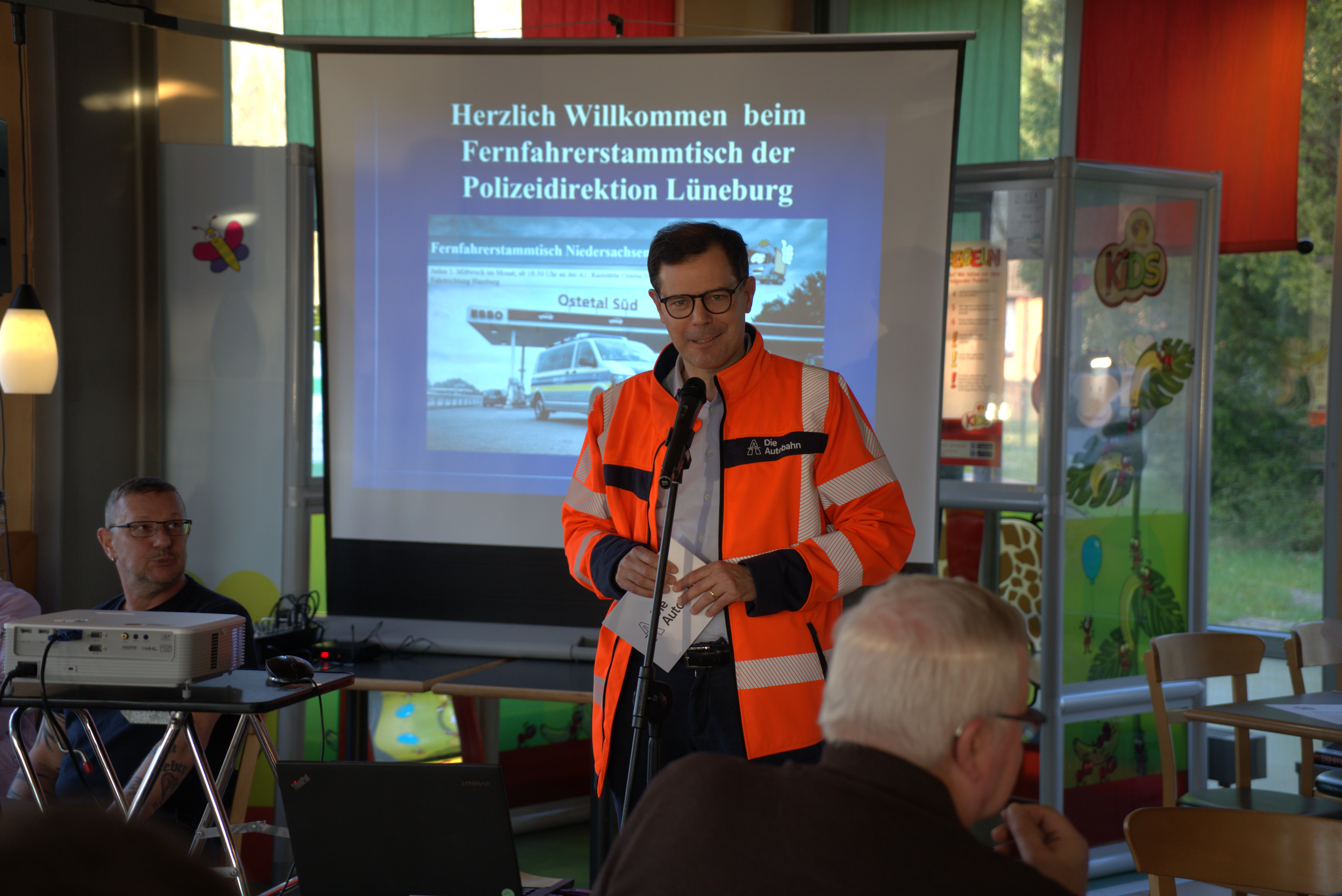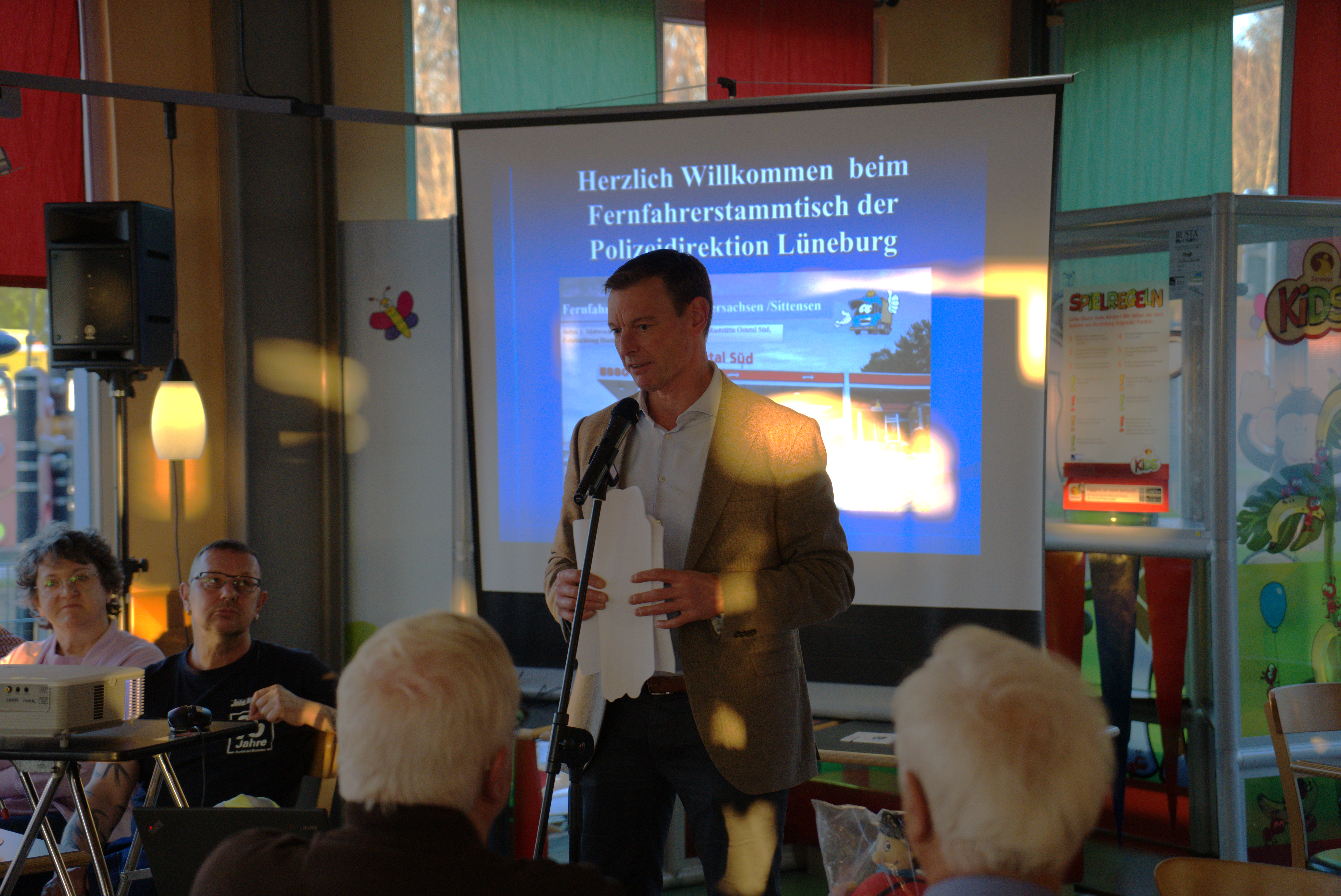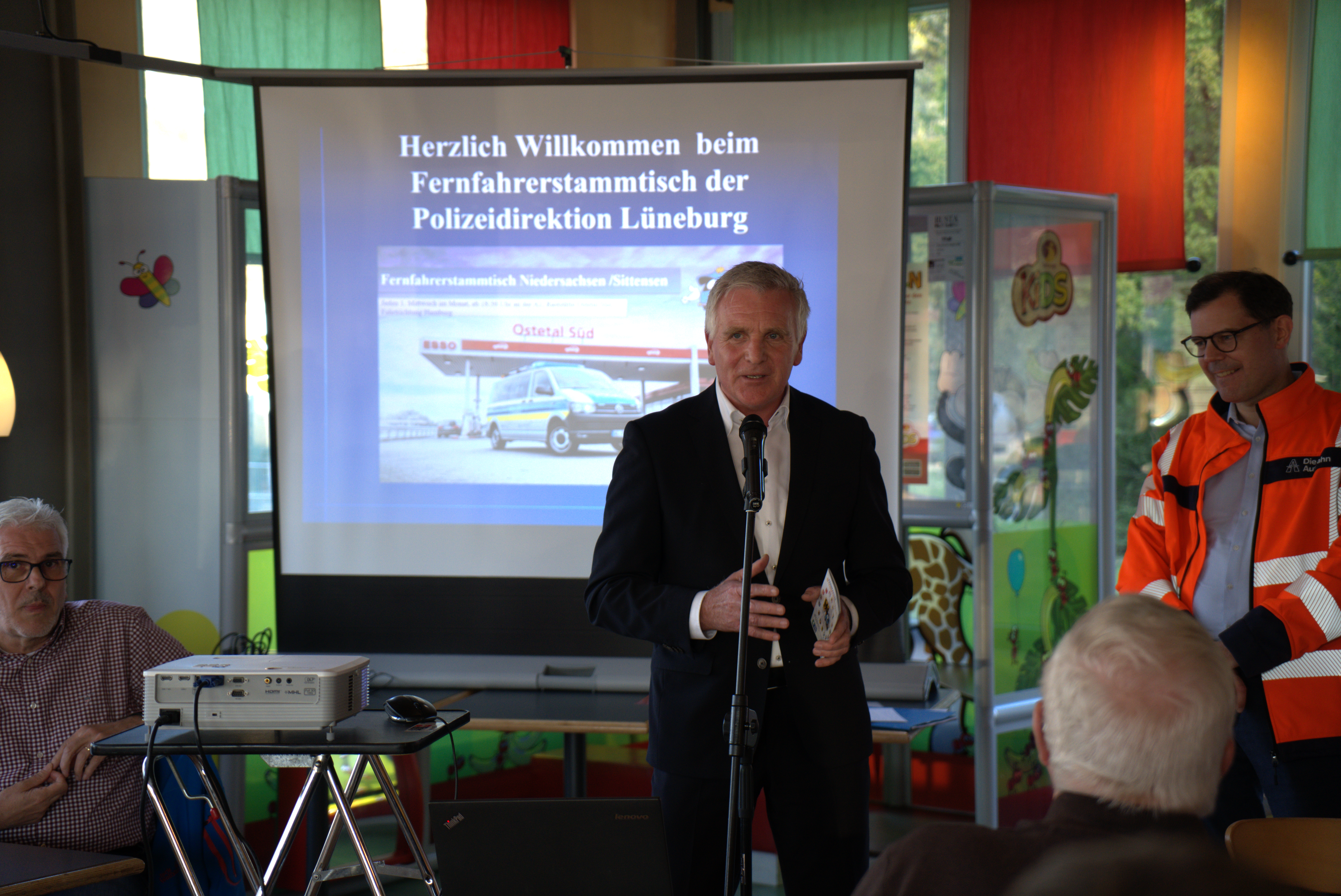 Polizeihauptkommissarin Andrea Möller und Polizeipräsident Thomas Ring eröffneten den Fernfahrerstammtisch mit einleitenden Worten. Ring betonte die Bedeutung des kontinuierlichen Austauschs zwischen Polizei und Berufskraftfahrern und lobte das Engagement der Moderatorinnen und Moderatoren. Dass mittlerweile über 20 Fernfahrerstammtische bundesweit stattfinden, wertete er als großen Erfolg.