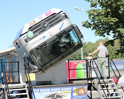 Ein absolutes Highlight an dem Tag der Lkw- Überschlagsimulator des deutschen Verkehrssicherheitsrats. Mit diesem konnte der praktische Sinn des Sicherheitsgurtes durch Jedermann erlebt werden. Die Teilnehmer waren sich nach der eindrucksvollen Fahrt sicher: NIE WIEDER OHNE GURT! Auch wurde deutlich, dass jeder lose Gegenstand im Führerhaus zur ernsthaften Gefahr für die Gesundheit werden kann.